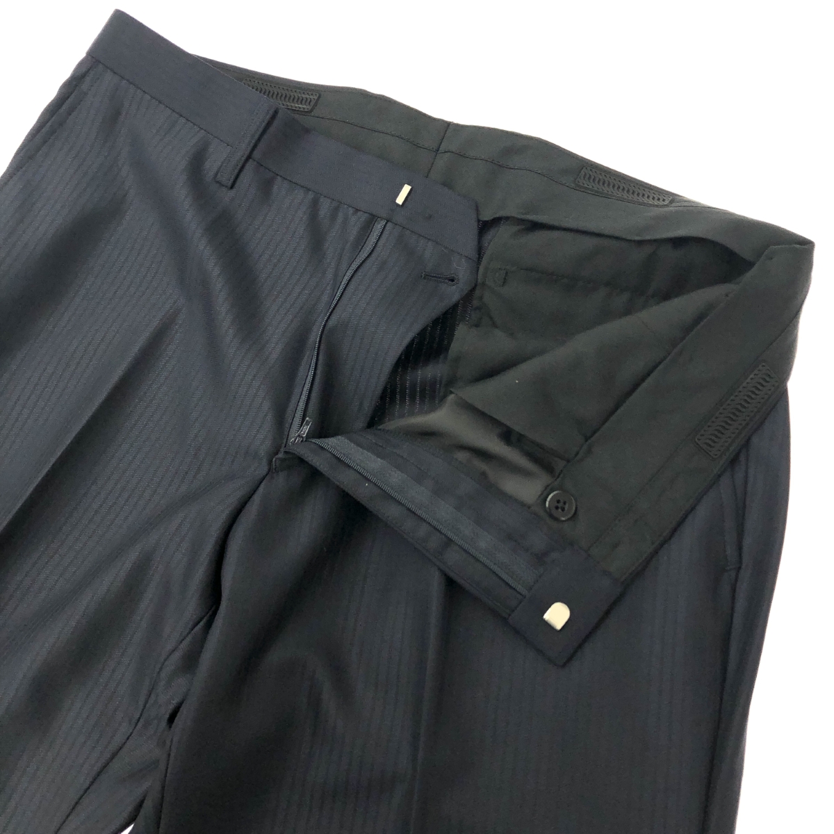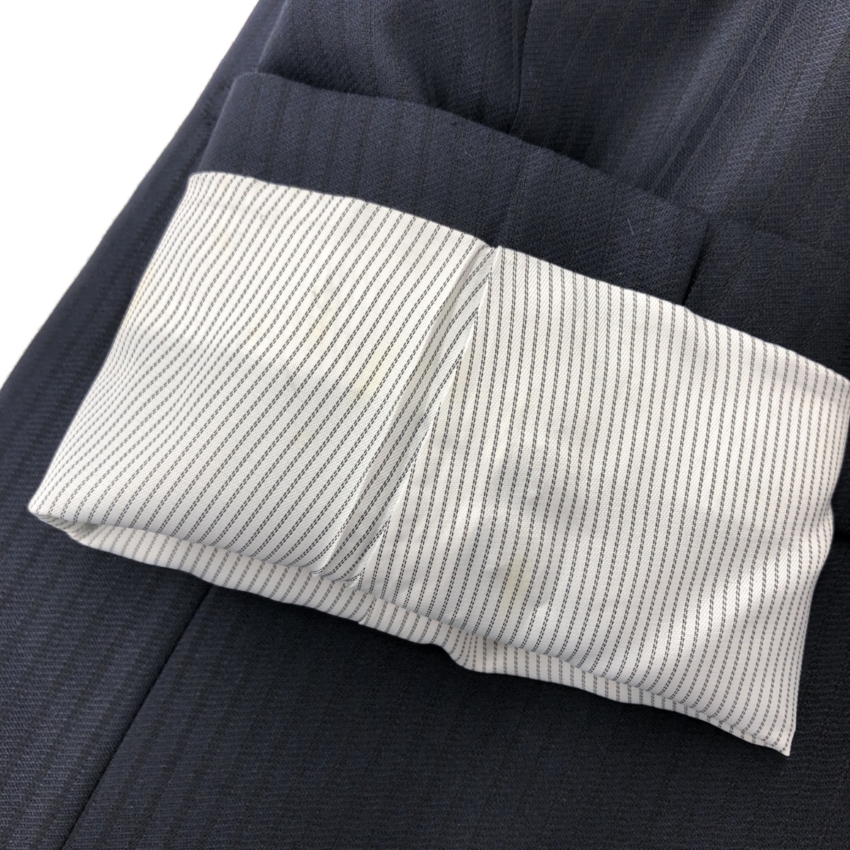2Bスリーピーススーツ ストライプ/背抜き/サイドベンツ ※素材は画像の素材タグをご確認ください。 画像にない場合は素材タグが無く素材不明となります。 |
