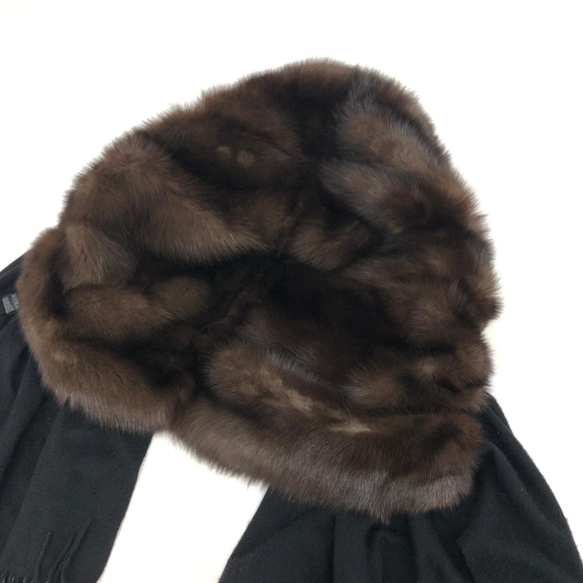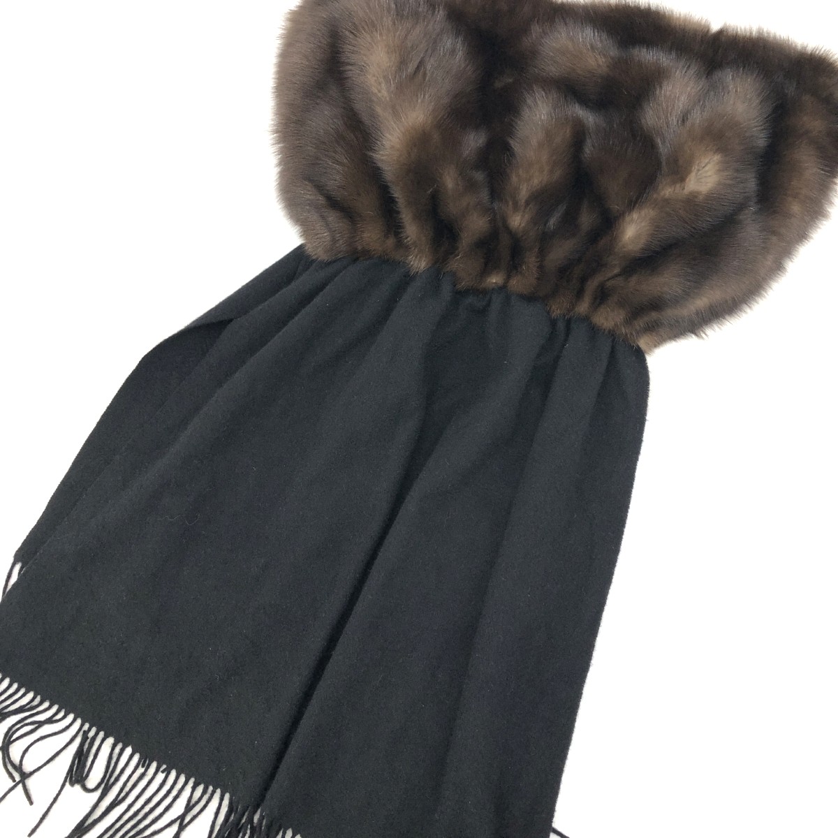 セーブルファー付きストール フリンジ/日本製 カシミヤ100% |