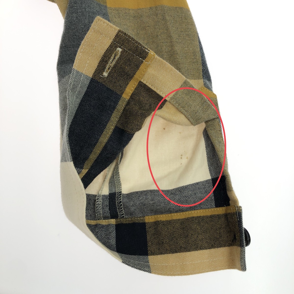 左袖裏シミ×襟変色 - ※スレ傷や汚れがある場合はその一部分のみ撮影を行っております。 画像に写っていない箇所にも同じようなスレ傷や汚れがある場合がございます。 |